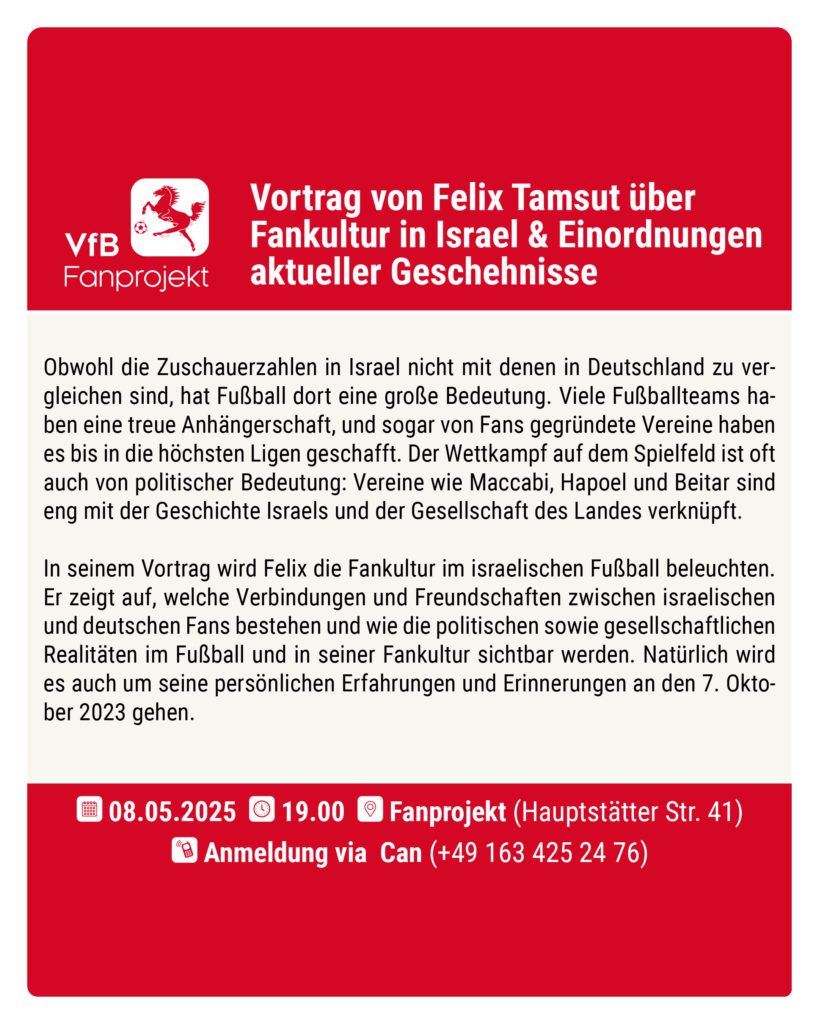Freut euch mit uns, wenn Felix am Abend des 08. Mai, dem 80. Jahrestag der „Befreiung von Faschismus & Krieg“, im VfB Fanprojekt über die verschiedenst ausgeprägten Kurven & Fankulturen Israels referiert und im Anschluss zu einer offenen Frage- & Diskussionsrunde einlädt.
