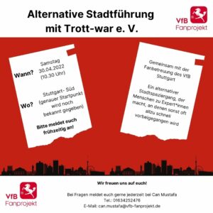 Liebe VfB-Fans, jeder kennst Sie: die Verkäuferinnen und Verkäufer der Straßenzeitung Trottwar in ihren roten Westen. Ein Teil der Verkäufer*innen möchte Euch unbekannte Orte von Stuttgart zeigen. Orte jenseits von…