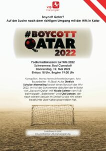 „Boykott Qatar“ in der Schwemme Korruption, Menschenrechtsverletzungen, tote Bauarbeiter – Fußball-Autor Dietrich Schulze-Marmeling fordert einen Boykott der WM 2022 in Katar. Im Hof vor der Schwemme diskutiert der Initiator von…
