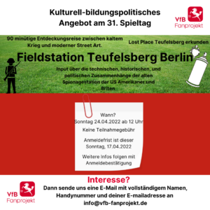 Liebe VfB’ler*innen, zum Auswärtsspiel unseres VfBs bei der Hertha in Berlin am 24.04.2022 möchten wir euch auf folgende zwei Angebote des VfB Fanprojekts und der VfB Fanbetreuung hinweisen. Zum einen…
