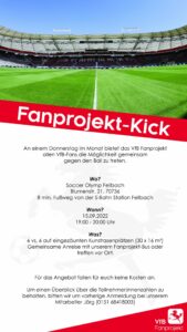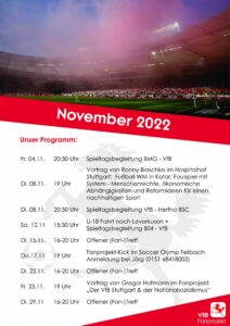 Liebe VfB Fans, wir wünschen euch einen guten Start ins Jahr 2023. Wir starten den Januar mit zwei Veranstaltungen und reichlich Spieltagsbegleitung. Mehr dazu in der Monatsübersicht vom Januar! Liebe…
