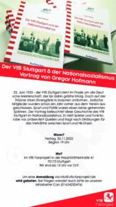 Hallo zusammen, am Freitag, den 25.11.2022, werden wir in unseren Räumlichkeiten endlich Gregor Hofmann eine Bühne geben. Der Vortrag über den VfB Stuttgart zu Zeiten des Nationalsozialismus wirft notwendiges Licht…