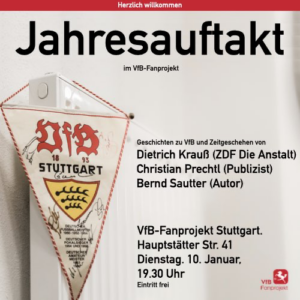 Jahresauftakt im VfB Fanprojektam 10. Januar begrüßen wir euch in der Hauptstätterstraße zum gemütlichen Zusammenkommen um Geschichten rund um den VfB Stuttgart zu lauschen. Es sprechen: Dietrich Krauß (ZDF Die Anstalt)Christian Prechtl…