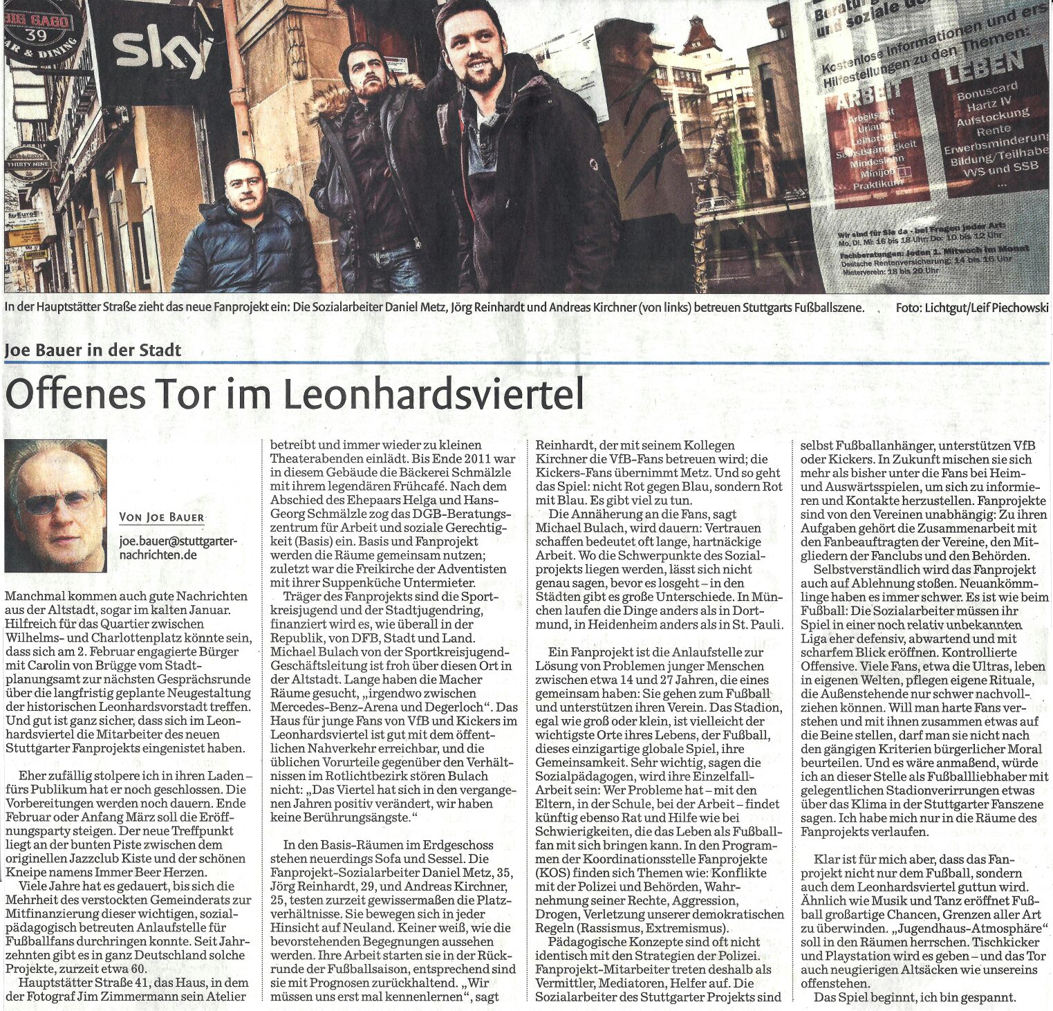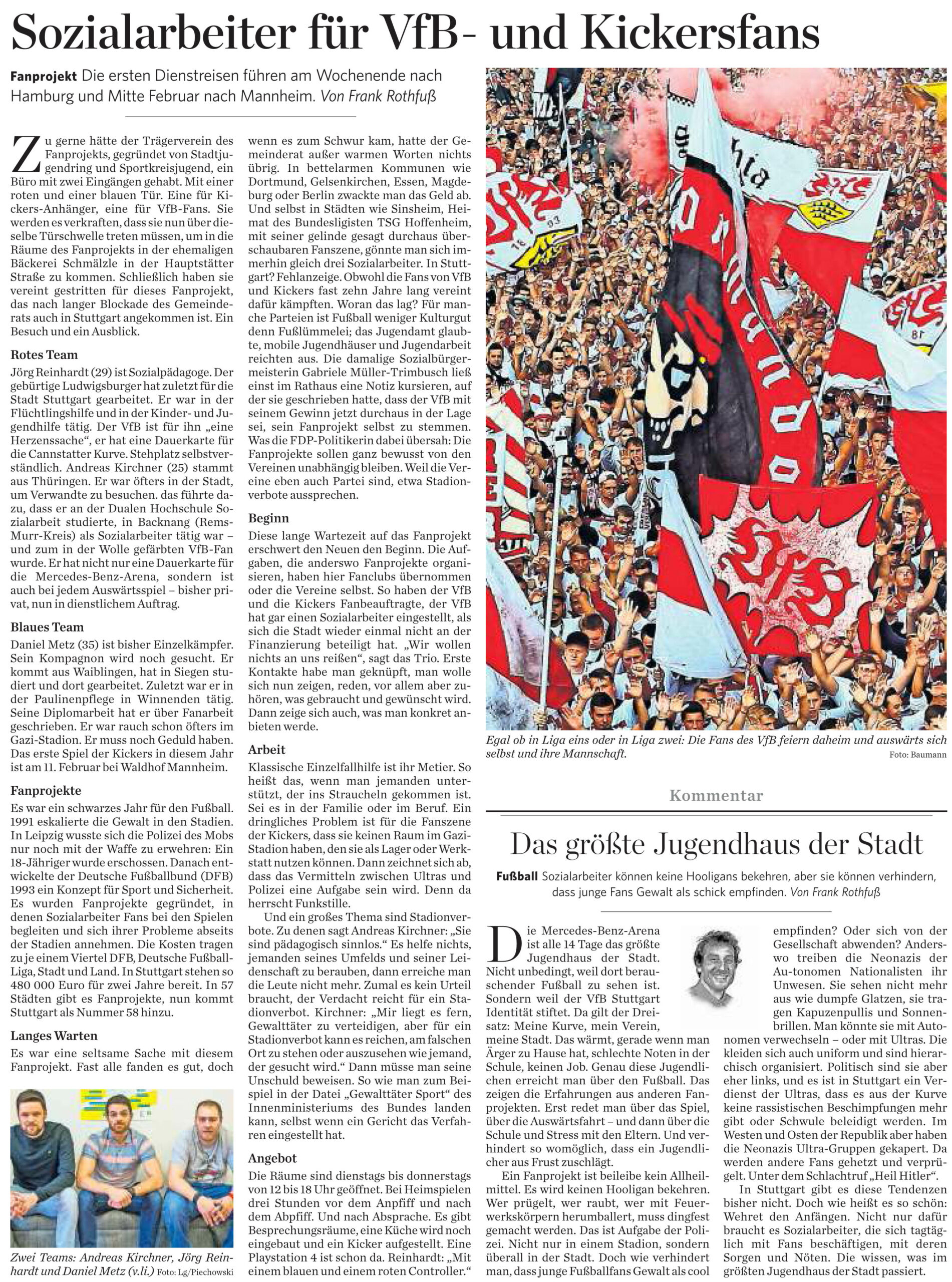 Presseartikel über unsere Arbeit Über uns VfB x STR Podcast des VfB – Stadionerlebnis in Madrid aus Sicht des VfB Fanprojekt. Can Mustafa im Gespräch mit Riky Palm – September 2024mehr erfahren VfB StuttgartVfB x STR Podcast im Fanprojekt – Im Gespräch mit Andreas Grupp und Dr. Bertram Sugg (Präsidiumskandidaten) Juli 2024mehr erfahren Über uns VfB x STR Podcast des VfB – Can Mustafa, Florian Güntert und Patrick Eberle des VfB Fanprojekts im Gespräch mit Riky Palm & Sebastian Buzze – Juni 2024mehr erfahren Sexualisierte Gewalt„Missbrauch, Prävention & sexualisierte Gewalt“ – ein Interview mit dem VfB FanprojektNelly Swiebocki-Kisling – Juni 2024mehr erfahren Anpfiff fürs Klima„Wer wird Klima-Meister im Fußball?„Bundesministerium für Umwelt, Naturschutz, nuklear Sicherheit und Verbraucherschutz – Juni 2024mehr erfahren VfB Stuttgart„EM 2024 – nur ein Sommermärchen?“ Podiumsdiskussion zur Einordnung der EM2024 am Austragungsort Stuttgart Moderation von Riky Palm – Juni 2024 mehr erfahren Verschiedenes„VfB Stuttgart zwischen Höhenflug und Chaos„- mit Patrick Eberle und Florian GüntertBolzplatz (ZDF) – April 2024mehr erfahren Veranstaltungen„Diskussionsrunde zu Sportwetten: Warum VfB-Sponsor Winamax ein Reizthema bleibt“ Danny Galm (Zeitungsverlag Waiblingen) – April 2024mehr erfahren Über uns Jannis & Can zu Gast beim Exil-Podcast des VfB „VerdammterVfB“ Februar 2024mehr erfahren Anpfiff fürs Klima„Grüner Einwurf – Der Podcast über Nachhaltigkeit im Sport. Bildungsprojekt „Anpfiff fürs Klima“ – im Gespräch mit Ex-Profi Timo Hildebrand, Max Himberger (Siegmund Space & Education gGmbH) & Can Mustafa (Fanprojekt VfB Stuttgart) – Februar 2024mehr erfahren Anpfiff fürs Klima„Klimawandel und Fußball: Wie das VfB-Fanprojekt für das Thema sensibilisieren will“ Danny Galm (Zeitungsverlag Waiblingen) – Februar 2024mehr erfahren Anpfiff fürs Klima„Wie der Anpfiff fürs Klima mit VfB-Unterstützung gelingen soll“Philipp Maisel (StN) – Februar 2024mehr erfahren Rechtsextremismus im FußballNazis auf der Tribüne – Podiumsdiskussion im Cann in Bad CannstattFranziska Mayr (Kontext Wochenzeitung) – Januar 2024mehr erfahren Rund um den Spieltag„Stadionallianzen„ als Konfliktlöser bei Fans und Polizei?“ – unter anderem mit Angela Furmaniak, Rechtsanwältin der Fanszene und einem Vorstandsmitglied des Fanprojekt Stuttgart e.V.Thorsten Poppe (Deutschlandfunk) – Dezember 2023mehr erfahren Nachspielzeit „Preisgekrönte „Nachspielzeit“: Wie junge Männer in Untersuchungshaft durch Fußball etwas über Demokratie lernen“Beitrag von RegioTV – Mai 2023mehr erfahren Nachspielzeit „Nachspielzeit im Stuttgarter Knast: Fußball als Anstoß für Gespräche über Demokratie in U-Haft“Beitrag von RegioTV – Mai 2023mehr erfahren Über uns Can Mustafa vom VfB Fanprojekt über seine Arbeit, den VfB, Fußballfans & PolizeigewaltPodcannstatt mit Philipp Maisel, Christian Pavlic – März 2023 mehr erfahren Rund um den Spieltag„Hat der VfB ein Problem mit seinen Fans?“Gregor Preiß (Stuttgarter Nachrichten) – März 2023mehr erfahren Rund um den Spieltag „Kennzeichnungspflicht für die Polizei? – Das sagen die Fan-Projekte„Jürgen Frey (Stuttgarter Nachrichten) – November 2022mehr erfahren Sexualisierte Gewalt„Sexualisierte Gewalt im Stadion: Wie der VfB Stuttgart Betroffenen helfen will“ Danny Galm (Zeitungsverlag Waiblingen) – Oktober 2022mehr erfahren Veranstaltungen„Wie Profifußball nachhaltig wird: Jung. Wild. Klimapositiv“ – Podiumsdiskussion Oktober 2022mehr erfahren Über uns„Sozialarbeit und Fankultur – Im Gespräch mit dem VfB Fanprojekt„STR Podcast mit Riky Palm und Sebastian Buzze – Juli 2022mehr erfahren Veranstaltungen„Boycott Qatar?“ – Podiumsdiskussion zur WM in Katar Mai 2022mehr erfahren VeranstaltungenKontrastprogramm des VfB Fanprojekts zur WM 2022mehr erfahren Verschiedenes„Trotz Pandemie: Dem VfB-Fanprojekt geht die Arbeit nicht aus„ Gregor Preiss (Kreiszeitung Böblimger Bote) – Februar 2022mehr erfahren Nachspielzeit „Nachspielzeit“ gewinnt den „Lernanstoß“ 2022″Deutsche Akademie für Fußball-Kultur – 2022mehr erfahren Veranstaltungen„Kapital oder Kurve?“ – kicker-Redakteur B. Hofmann präsentiert sein neues Buch über den VfBlive aus der Schwemme inkl. Podiumsdiskussion Oktober 2021mehr erfahren Veranstaltungen„Das Duell um die Präsidentschaft Vogt vs. Steiger“ live aus der Schwemme in Bad CannstattJuli 2021mehr erfahren Veranstaltungen„Die Lebenswelt von LSBTIQ+ Menschen in Stuttgart …und was der Fußball damit zu tun hat“ – Podiumsdiskussion Stuttgart – Januar 2021mehr erfahren VeranstaltungenSammlung von Bernd Sautter bis 2021mehr erfahren Über uns Podcast Nachspielzeit – mit Jörg Reinhardt & Andres Kirchner vom VfB FanprojektOktober 2019 mehr erfahren VfB Lernzentrum Alle Infos zum VfB Lernzentrum mehr erfahren VfB Lernzentrum „Integration und Austausch im VfB Lernzentrum“mehr erfahren Veranstaltungen„Die Präsidentschaftskandidaten Vogt & Riethmüller im Check“ – PodiumsdiskussionNovember 2019mehr erfahren VfB Lernzentrum „Mercedes-Benz-Arena als Klassenzimmer – Lernprojekt will beim VfB neu durchstarten“Philipp Maisel (Stuttgarter Zeitung) – Oktober 2019mehr erfahren Veranstaltungen„Traditionsabend“ im Fanprojekt“ – Podiumsdiskussion rund um den VfB Stuttgart Stuttgarter Nachrichten – Februar 2019 mehr erfahren Über uns„Fanprojekt Stuttgart hat sein Zuhause nun in der Hauptstätter Straße – Anlaufstelle für die Sorgen der Fußballfans“Thorsten Streib (Esslinger Zeitung) – April 2017mehr erfahren Über uns „Offenes Tor im Leonhardsviertel“Joe Bauer (Stuttgarter Zeitung) – Januar 2017mehr erfahren Über uns„Sozialarbeit für VfB- und Kickers Fans“ Frank Rothfuß (Stuttgarter Zeitung) – Dezember 2016mehr erfahren