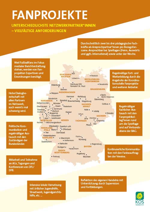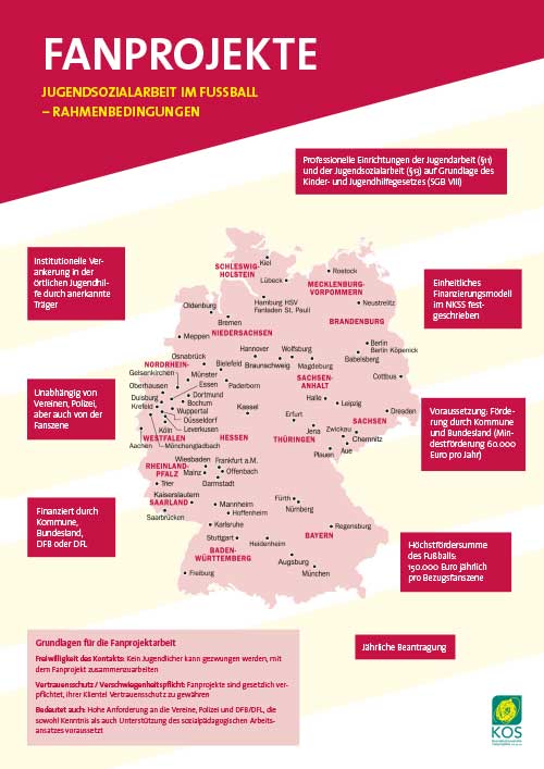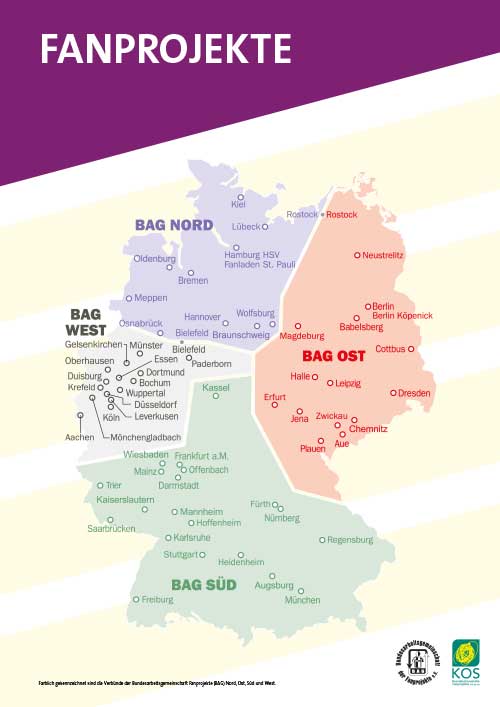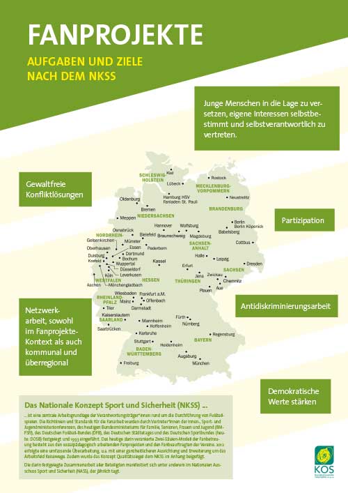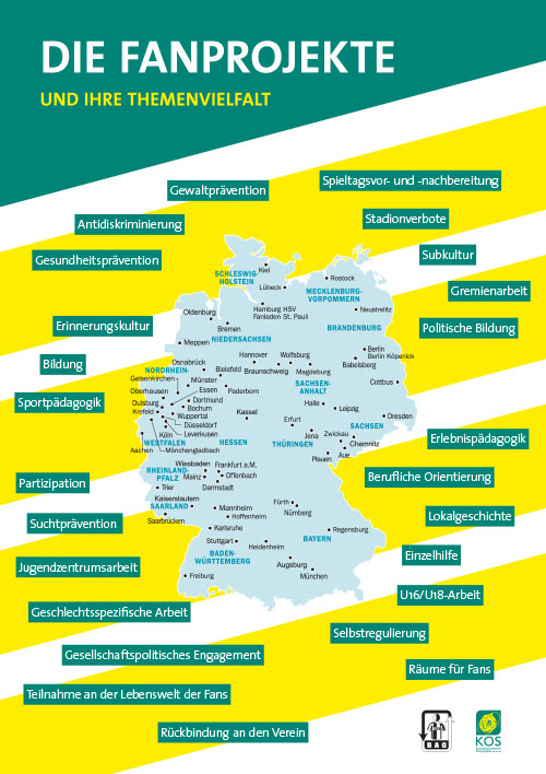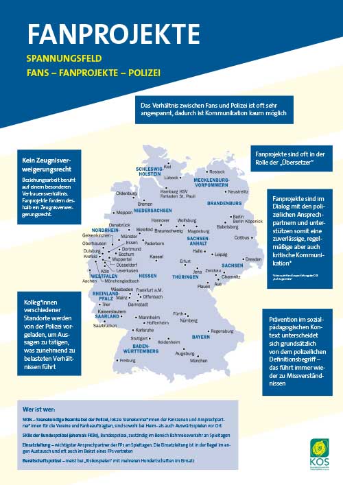 Standort Plakate Plakatreihe zu den sozialpädagogischen FanprojekteDie Plakatreihe stellt übersichtlich und nach zentralen Herausforderungen getrennt, das Arbeitsfeld der sozialpädagogischen Fanarbeit dar. Quelle: Koordinationsstelle Fanprojekte